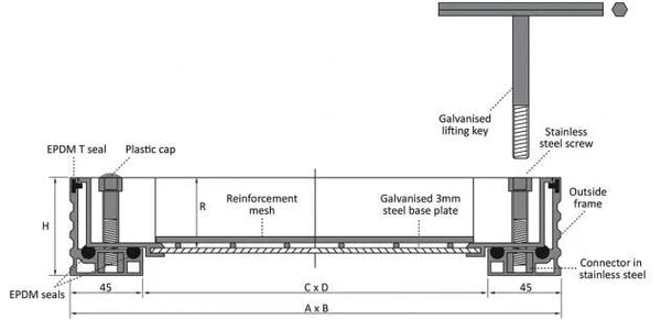 The triple sealing system is designed to deliver maximum protection, with two EPDM gaskets and a T-rubber insert working together to block odours and resist water ingress. Each lifting point features a locking bolt for enhanced security, while two lifting keys are provided to allow safe and easy access whenever maintenance is required.